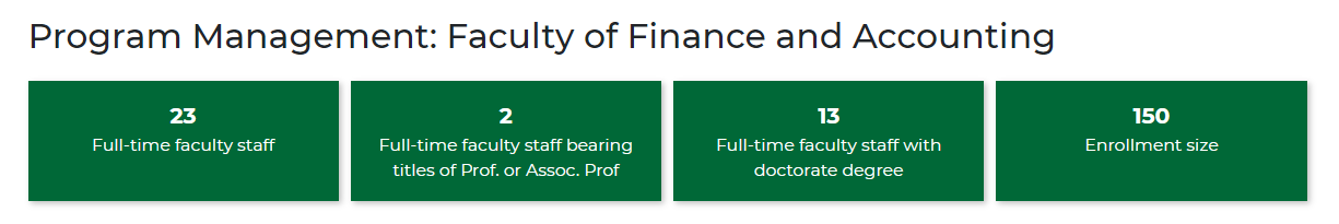 The Accounting Programme opened in 2012, so far has 05 graduated courses with 348 graduates. Currently, the programme has 693 students. The programme has the outstanding feature of connecting with businesses in providing practical training for students, helping students get acquainted with the business environment, gain real-life knowledge and improve professional skills in order to meet the needs of businesses after graduation.Job position of graduatesThe Accounting Programme to work in the following positions: