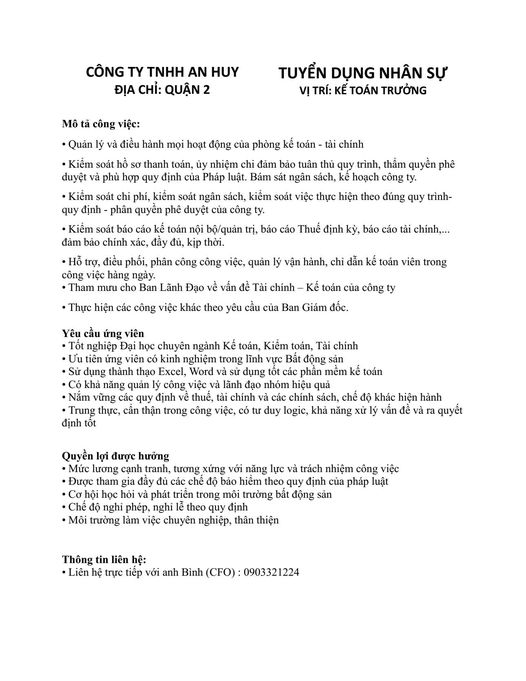 Công ty TNHH An Huy tuyển dụng Kế toán trưởng