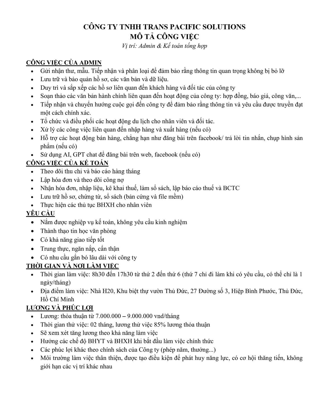 CÔNG TY TNHH TRANS PACIFIC SOLUTIONS TUYỂN DỤNG