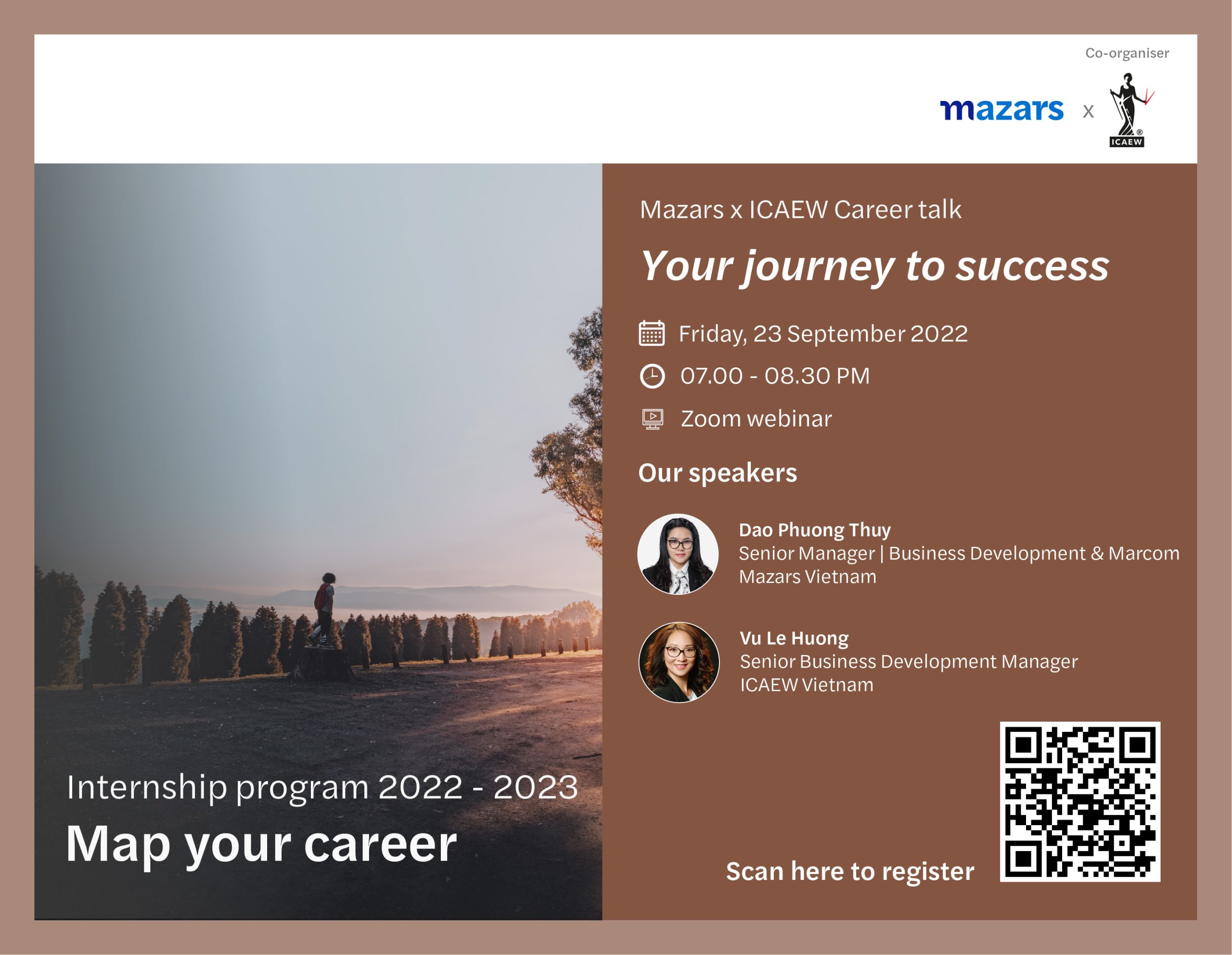 Với mong muốn mang đến cho các bạn những câu chuyện chân thật nhất về môi trường làm việc, chính sách đãi ngộ hấp dẫn và hàng loạt những cơ hội thăng tiến khác tại một doanh nghiệp toàn cầu, ICAEW hân hạnh đồng hành cùng Mazars tổ chức buổi gặp mặt trực tuyến với tên gọi “Mazars & ICAEW career talk: Your journey to success”.