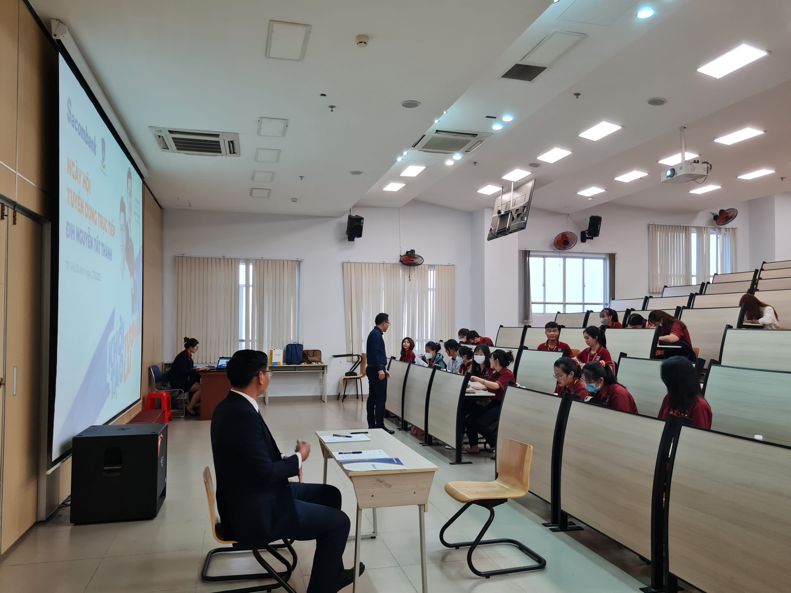 Trước khi bắt đầu phỏng vấn tuyển dụng trực tiếp, Ông Huỳnh Văn Hòa-Trưởng bộ phận tuyển dụng đã giới thiệu về ngày hội tuyển dụng của Sacombank, cung cấp cho sinh viên cần lưu ý chuẩn bị cho buổi phong vấn xin việc qua nội dung tương tác với chủ đề “ Những lý do khiến buổi phỏng vấn trở nên tồi tệ”. Những chia sẻ nhận được sự quan tâm, lắng nghe và sự nhiệt tình tham gia trả lời các câu hỏi từ phía sinh viên.