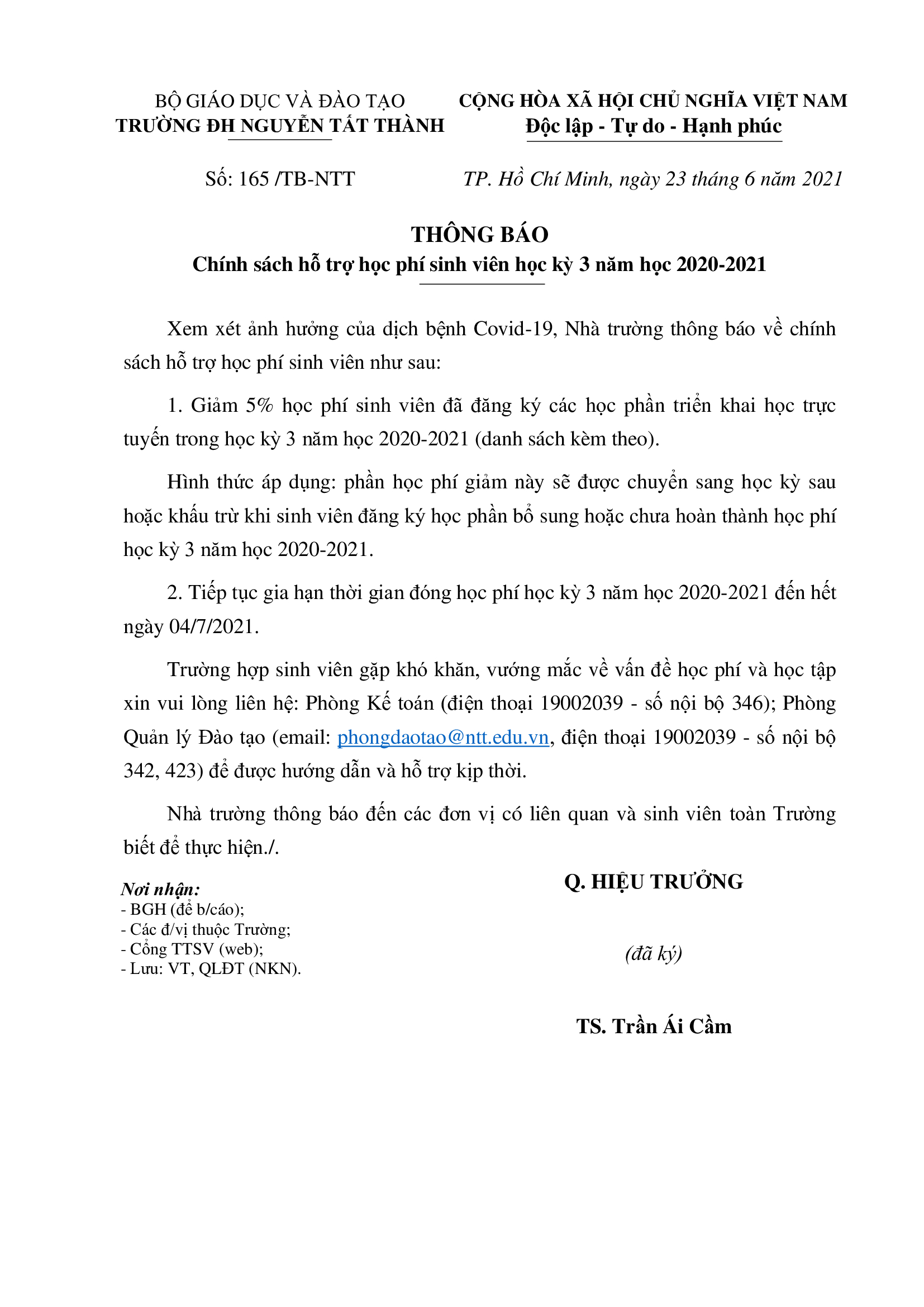 Thông báo: Chính sách hỗ trợ học phí sinh viên Học kỳ 3 năm học 2020-2021