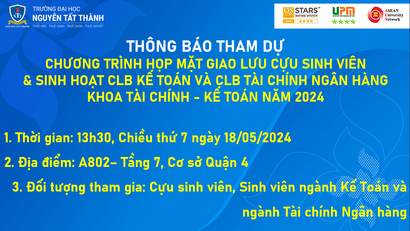 Thông báo Tham dự Chương trình Họp mặt Cựu sinh viên và sinh hoạt CLB học thuật Khoa Tài chính-Kế toán 2024