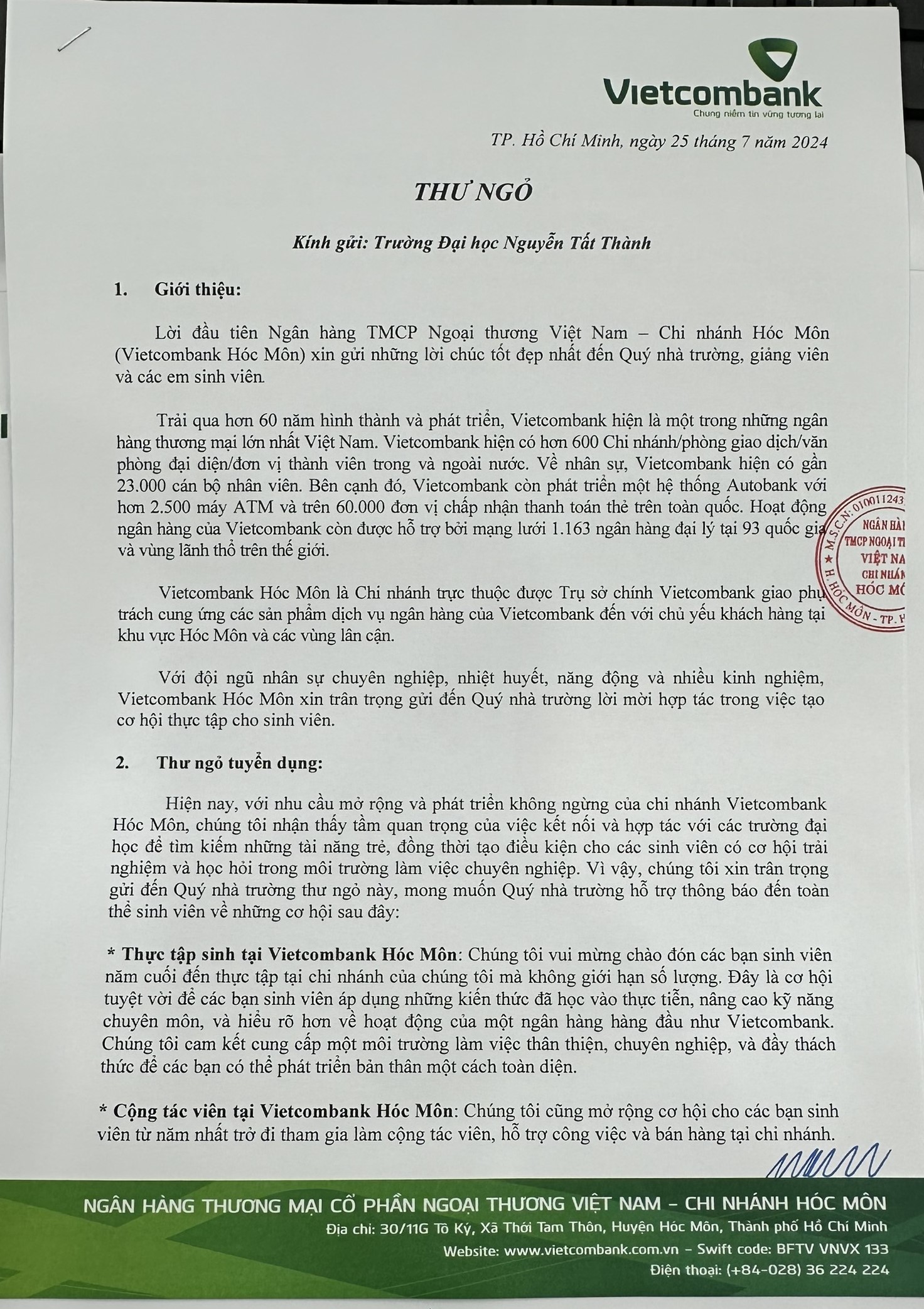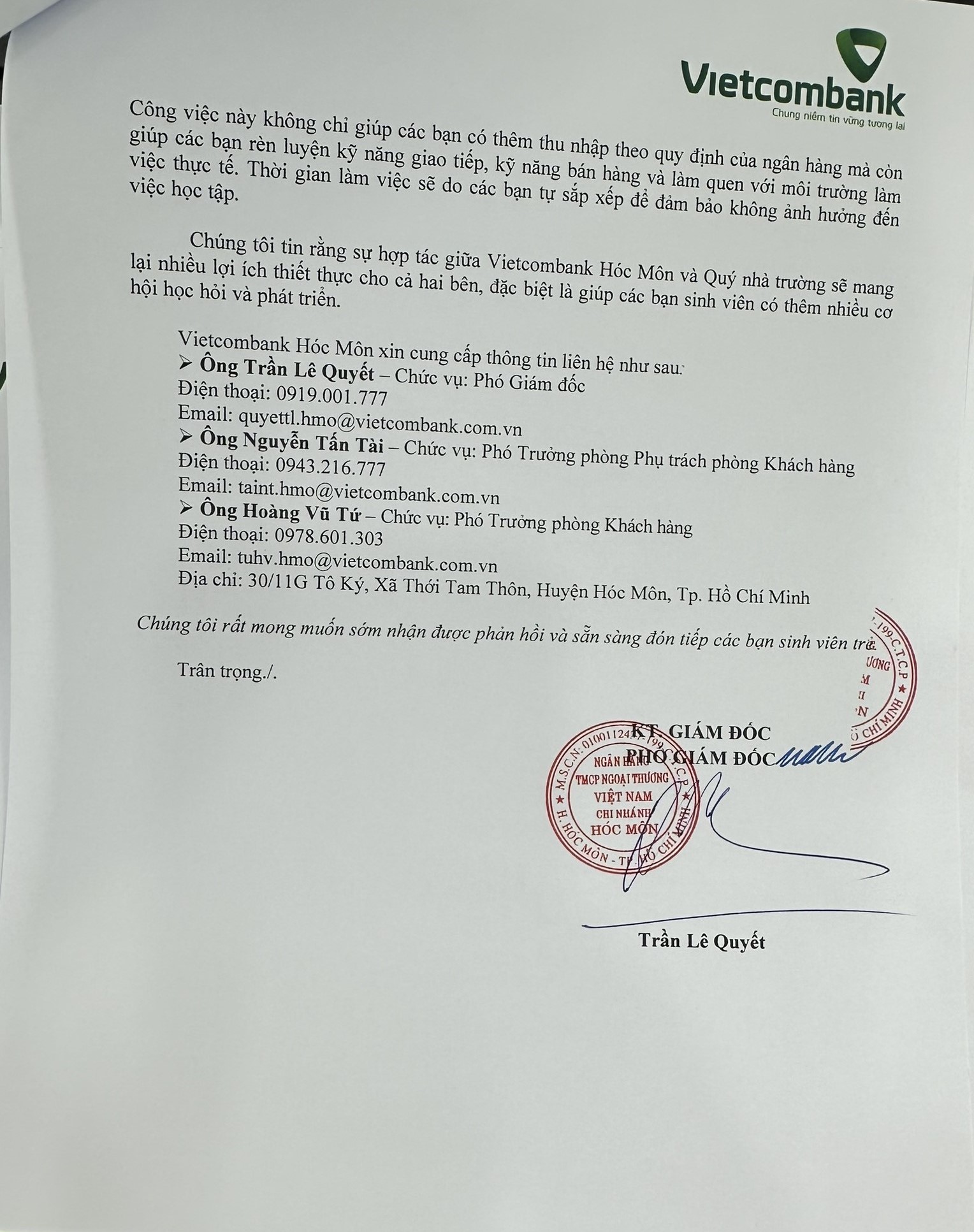 THÔNG BÁO TUYỂN THỰC TẬP TẠI VIETCOMBANK-CN HÓC MÔN THÔNG BÁO TUYỂN THỰC TẬP TẠI VIETCOMBANK-CN HÓC MÔN Chi tiết