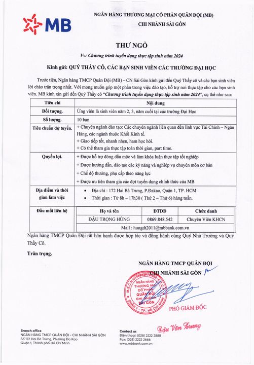 Thông tin Tuyển dụng thực tập sinh 2024 tại Ngân hàng TMCP Quân đội-CN Sài Gòn Chương trình thực tập sinh 2024 tại Ngân hàng TMCP Quân đội-CN Sài Gòn