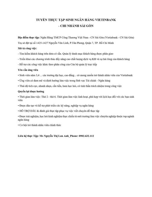 TUYỂN THỰC TẬP SINH NGÂN HÀNG VIETINBANK- CHI NHÁNH SÀI GÒN